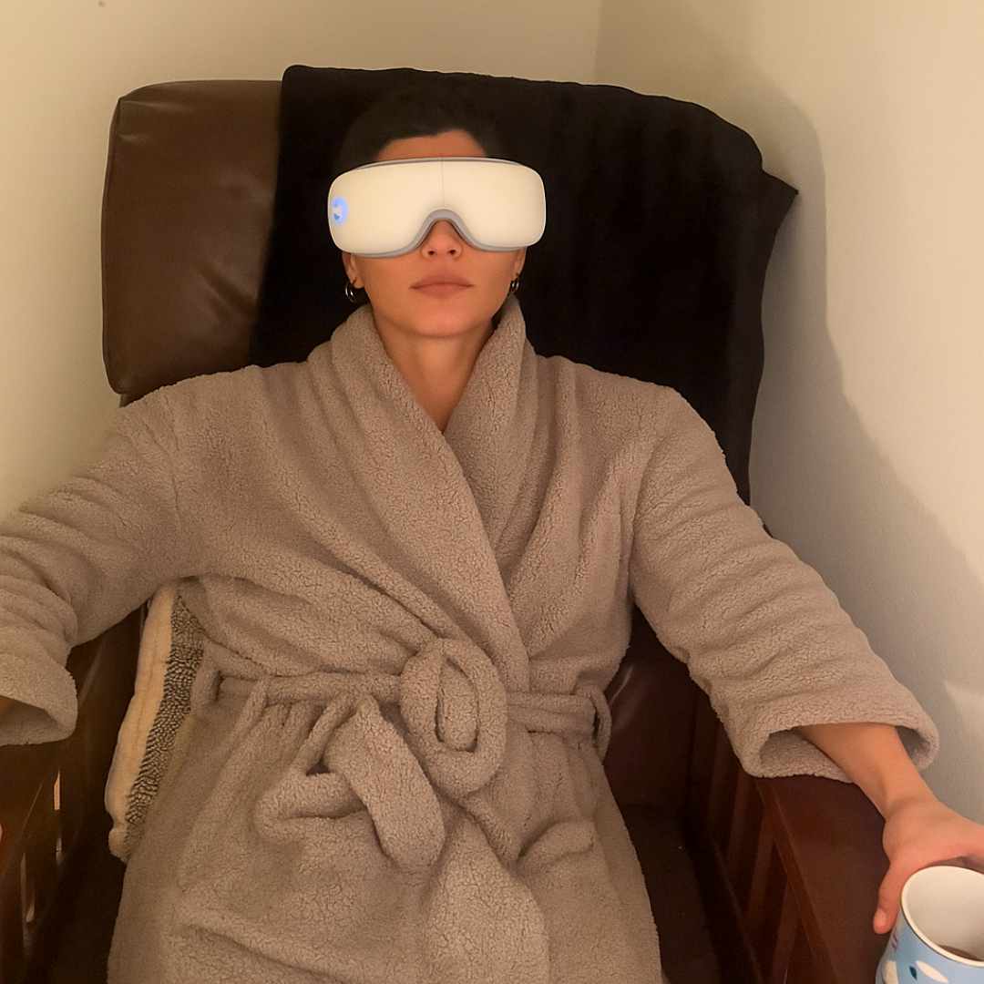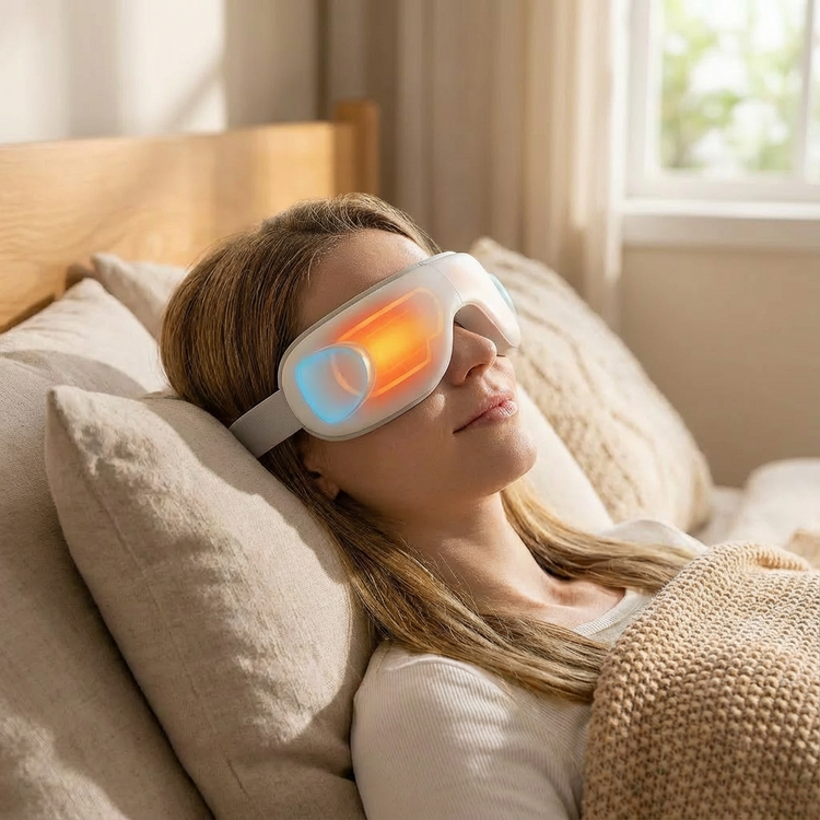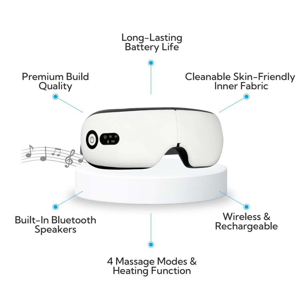 • Pulsing air compression around eyes and temples • Adjustable 38–42 °C heat therapy • Vibration and pressure-point migraine relief • Cord-free design with built-in Bluetooth speakers